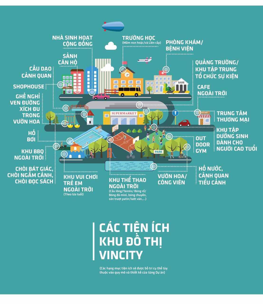 Khác với các khu đô thị khác (chỉ cung cấp một hoặc một số tiện ích nhất định), tất cả các dự án Vincity của tập đoàn Vingroup đều quy hoạch theo đúng mô hình khu đô thị khép kín đồng bộ cả về tiện ích và dịch vụ. bao gồm: