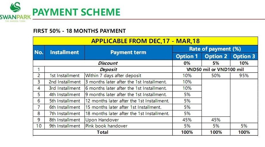 Tiến độ thanh toán dự án Swanpark Đông Sài Gòn “rất nhẹ nhàng” so với dự án của chủ đầu tư trong nước. Vì CFLD là chủ đầu tư đến từ Singapore nên từ lúc khách hàng đặt mua dự án cho đến trước khi nhận nhà mới thanh toán 50% trên tổng giá trị căn nhà. Cụ thể, lịch thanh toán của dự án Swanpark Đông Sài Gòn: