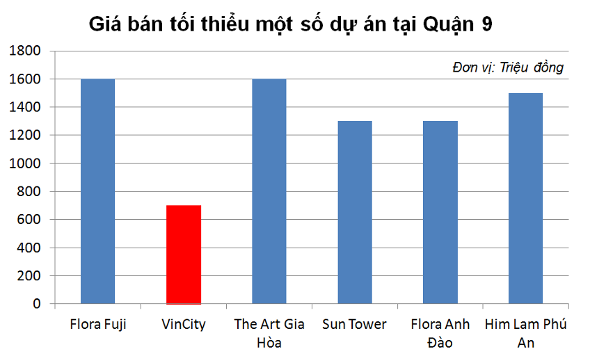 Giá bán căn hộ Vincity Quận 9 được coi là rẻ nhất trên thị trường bất động sản. Chỉ từ 700 triệu đồng/căn là bạn có thể sở hữu căn hộ giá rẻ mà chất lượng. So với giá bán của những căn hộ lân cận khác thì giá của dự án gần như rẻ hơn gấp đôi. Cụ thể: dự án Him Lam Phú An (1.5 tỷ), dự án Flora Anh Đào (1.3 tỷ), dự án The Art Gia Hòa (1.6 tỷ), dự án Sun Tower (1.3 tỷ),dự án Flora Fuji (1.6 tỷ).